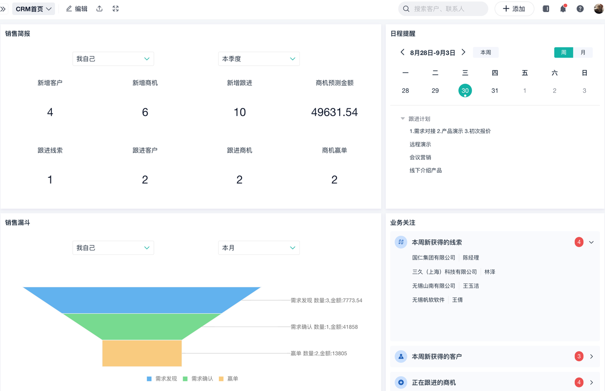 - 商机状态明确:每个商机的阶段、下一步动作和责任人清楚可查