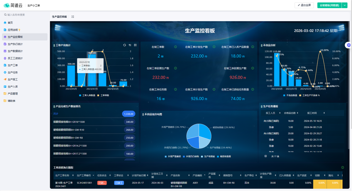 当生产线出现异常情况时,如设备故障、生产进度严重滞后等,生产监控看板会发出警报,提醒管理人员及时处理。通过简道云搭建的监控看板,可以实现数据的实时刷新和多维度钻取,从整体概览一路追溯到具体工单的异常原因。