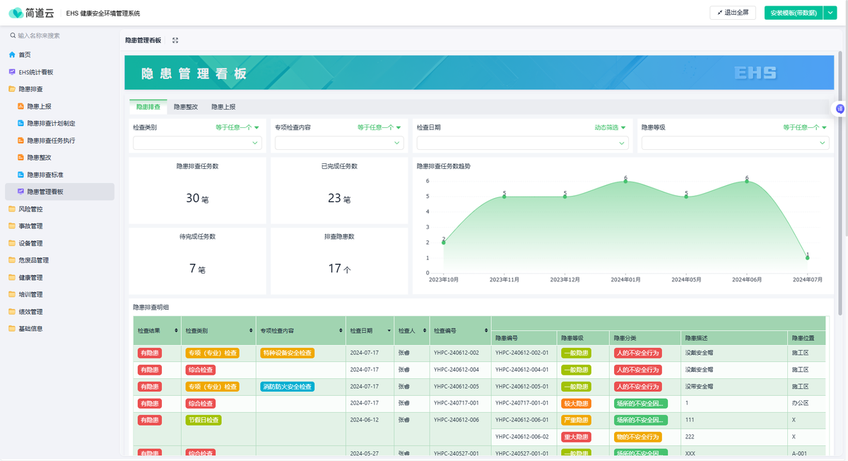 通过这种系统化构建,使不同层级的机构都能找准自身在安全格局中的定位,形成上下联动、专业协同的管理体制。在简道云中,企业可以为五大系统分别搭建管理应用,同时通过数据关联实现信息互通。 例如,生产运行系统发现的隐患数据,可自动同步至安全监督系统形成督办任务,监督结果再反馈至管理决策系统作为评审依据。