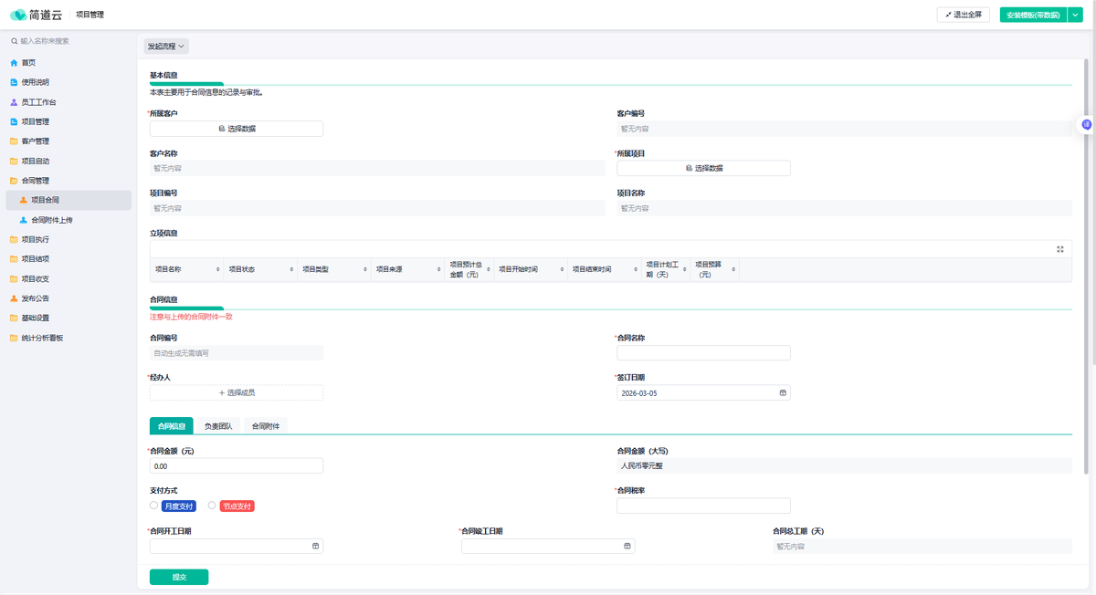 1. 项目合同信息管理 此功能是系统的基础模块,用于构建合同的主数据。它记录了合同的基本信息,如合同名称、编号、签约主体、合同金额、税率、生效及截止日期等。在简道云这类平台上,可以通过拖拽式表单设计快速搭建合同信息登记表,并利用数据关联功能将合同与具体的项目、客户进行绑定,实现数据的一次录入、多处引用。