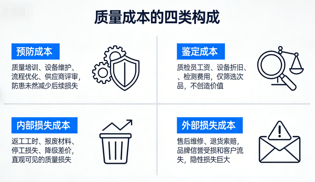 要把质量成本管明白,首先得知道钱都花哪儿了。质量成本主要分为以下四类: