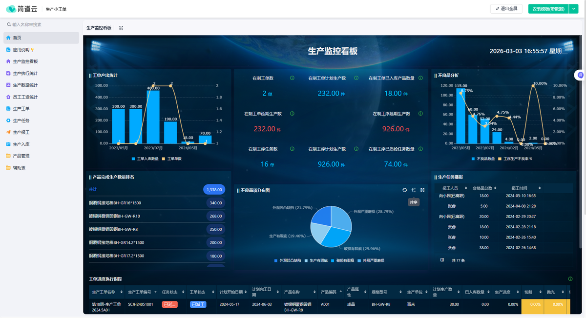 - 生产任务看板:在制工单数、延期数、工序任务数等关键指标可视化展示,管理者一目了然