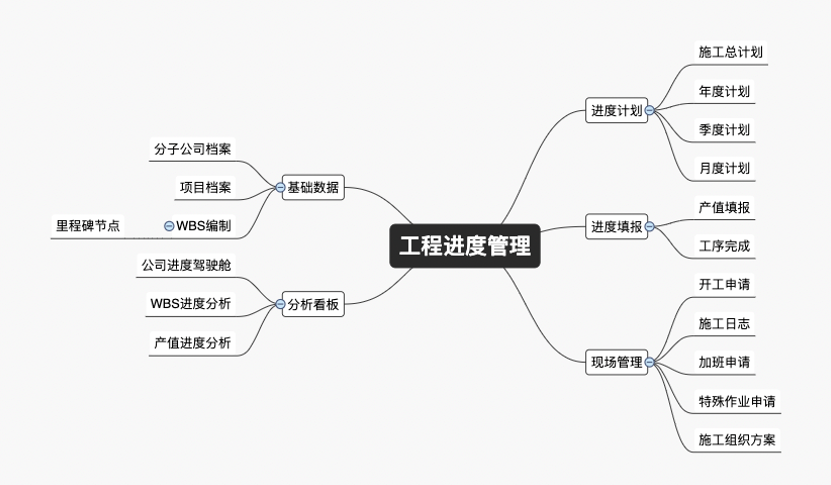 整个系统其实就四块:进度计划、进度填报、现场管理、统计分析。