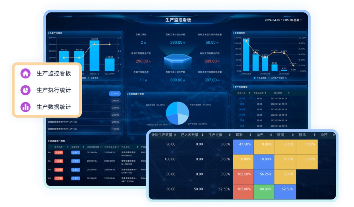通过可视化大屏,实时展示生产进度、设备状态、质量状况等核心指标。管理者可随时查看订单完成率、产线效率、缺陷排行等分析报表,数据实时刷新,支撑快速决策。