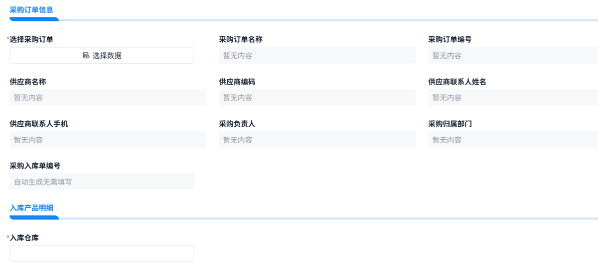 以采购入库为例,我建了一个申请表单,包括订单名称、供应商、采购负责人、入库仓库、采购总价、入库质检等。