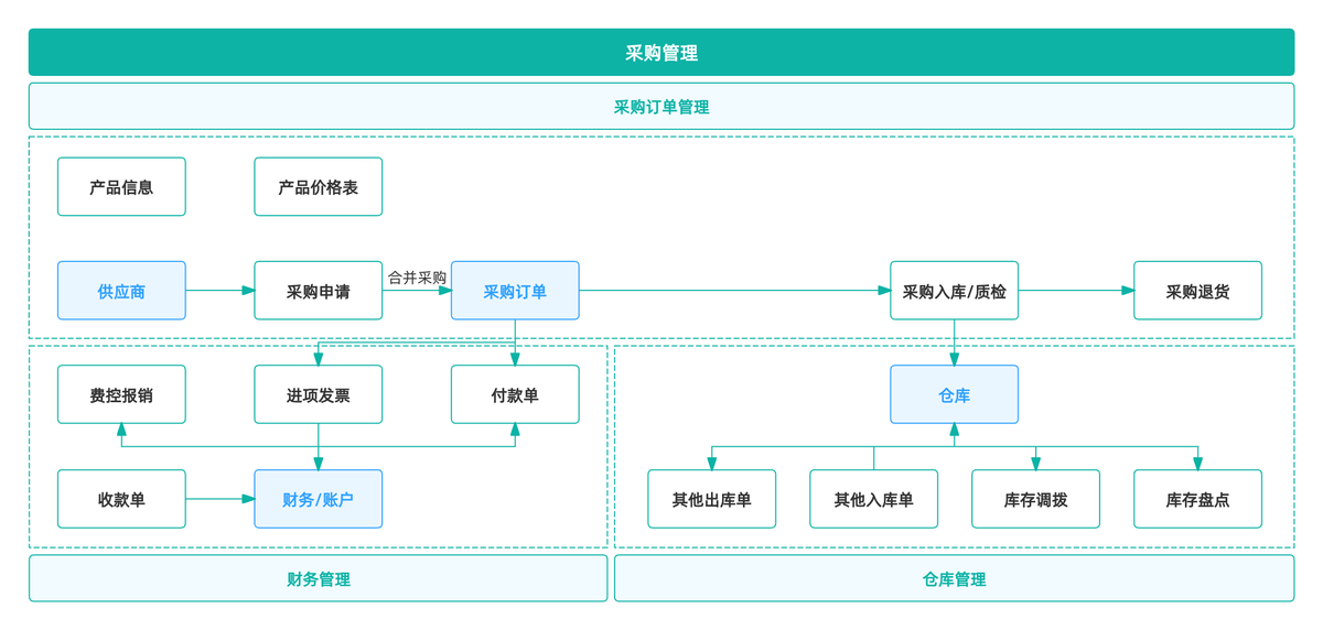 先上这张图: 供应商 → 采购 → 入库 → 生产/组装 → 出库 → 销售 → 客户 → 回款