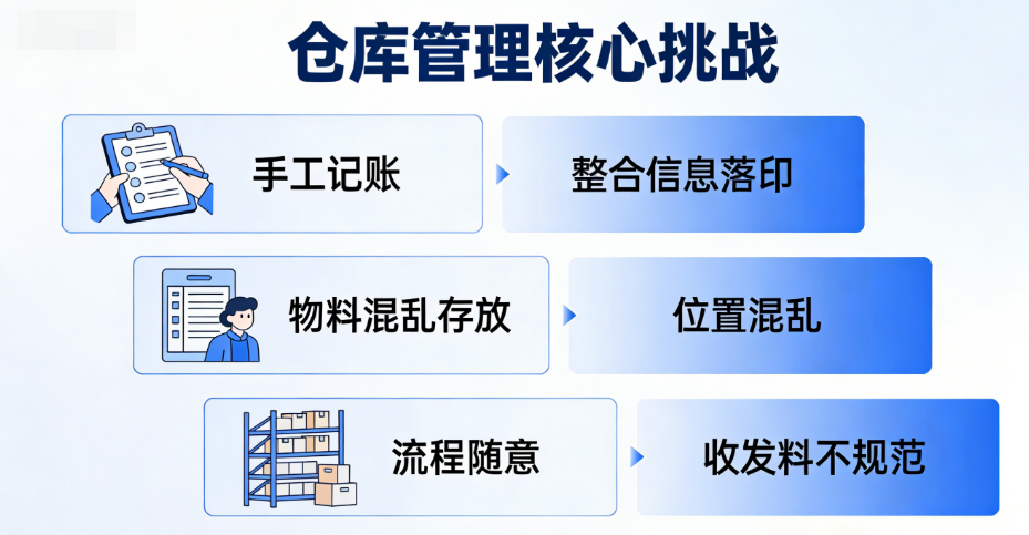 在没有WMS的传统管理模式下,仓库管理的核心挑战其实集中在三个方面:
