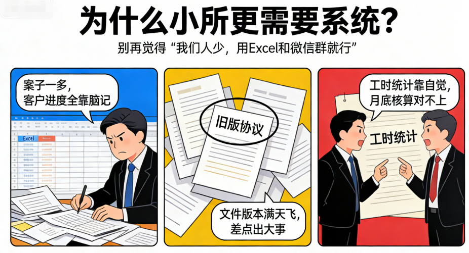 大家好,我在律所干了快十年管理,从三四人的小团队到三十多人的中型所都待过。这几年最头疼的事之一,就是给所里选管理系统。
