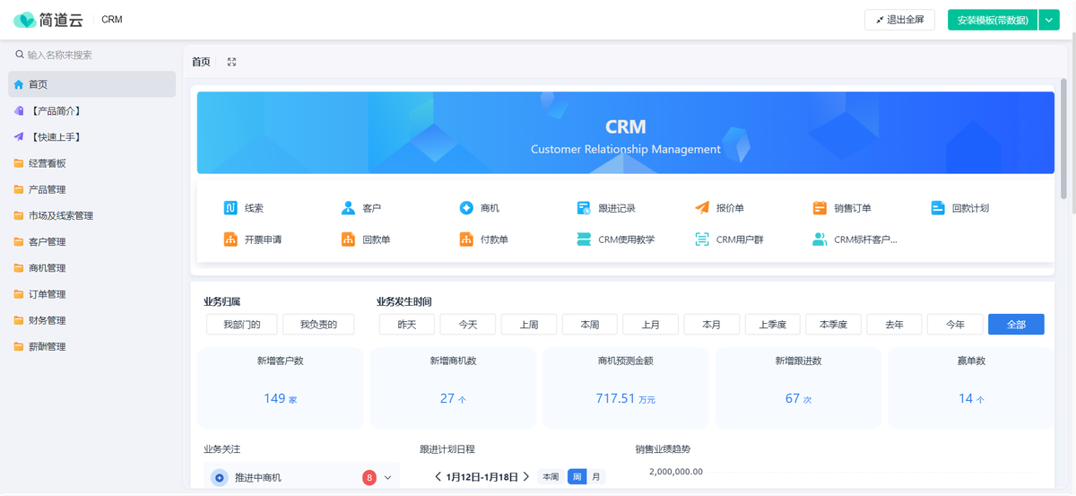 - 初创/小微企业:核心是轻量、易用的销售跟进与联系人管理。可考虑简道云这类零代码平台搭建的轻量CRM,或标准化SaaS产品。