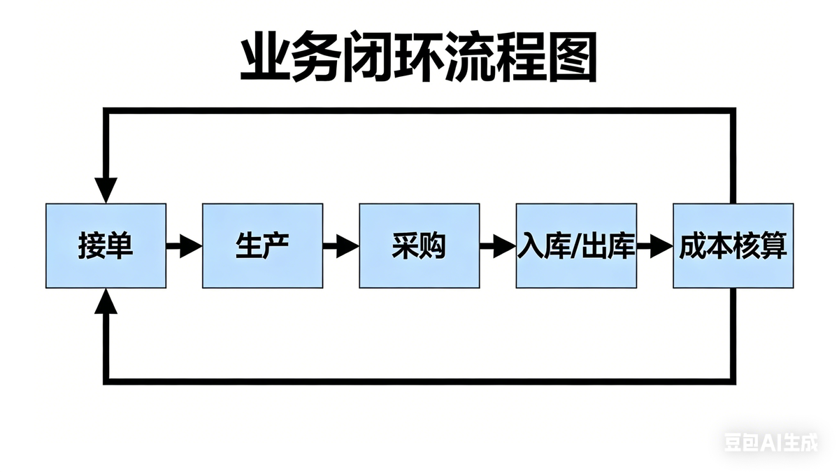 - 接单 → 生产 → 采购 → 入库/出库 → 成本核算