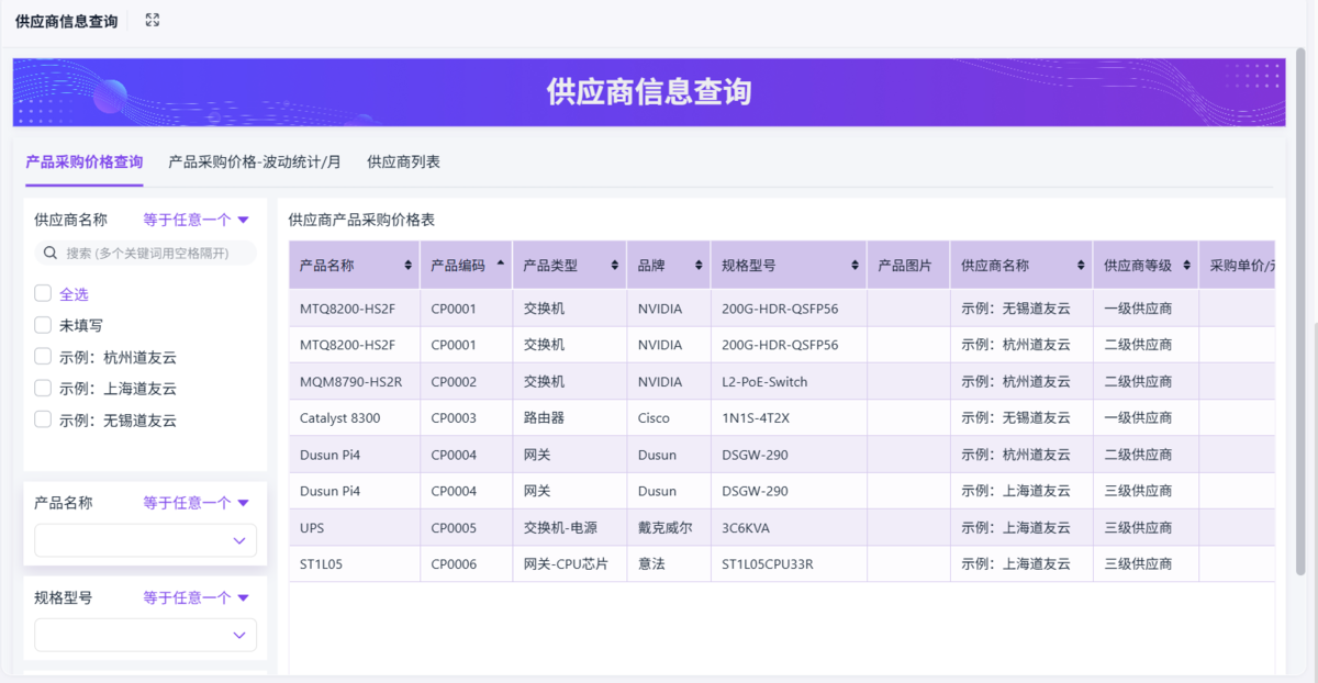- 固定字段:物料、数量、报价、交期、供应商