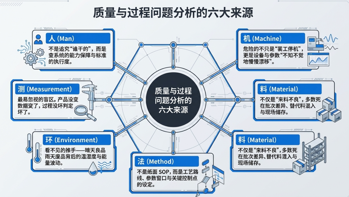 下面我把 5M1E(人、机、料、法、环、测)按生产现场能用的方式讲清楚:每一类到底包括什么、常见坑在哪、怎么验证、怎么改。