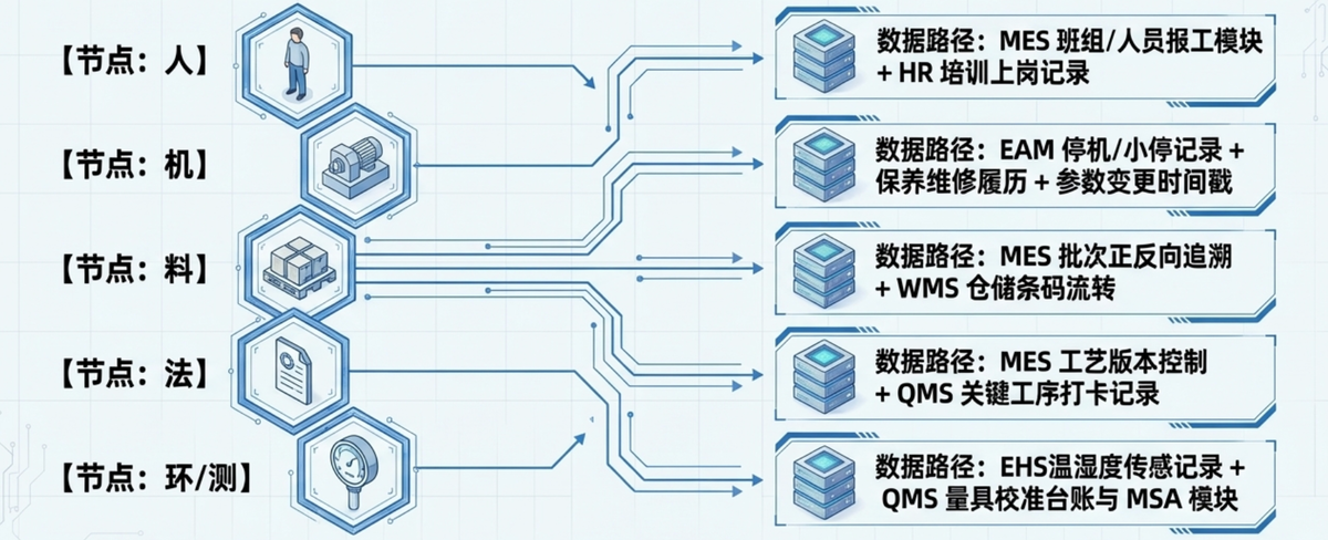- 料(Material):某批次波动/替代料/存储异常 数据来源:生产管理系统的批次追溯、来料检验;仓储系统/条码流转