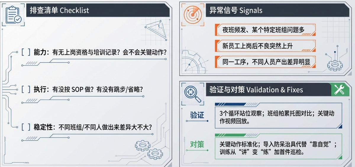 - 执行:有没有按 SOP 做?有没有跳步/省略?