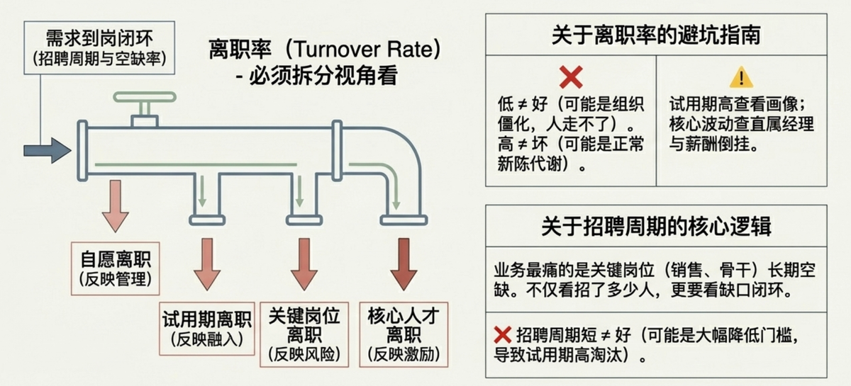 - 离职率高也不一定坏:结构调整期、组织新陈代谢也会拉高